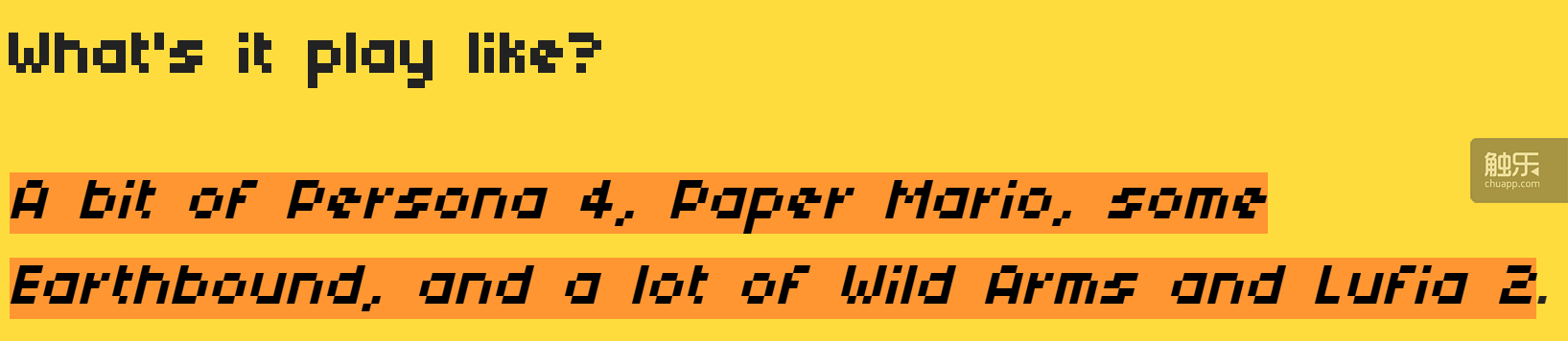 YIIK開(kāi)發(fā)團(tuán)隊(duì)對(duì)自己作品游戲體驗(yàn)的描述:稍微有點(diǎn)像《女神異聞錄4》(Shin Megami Tensei:Persona 4)和《紙片馬里奧》(Paper Mario),略微有些像《地球冒險(xiǎn)》(EarthBound),還和《荒野兵器》(Wild Arms)與《四狂神戰(zhàn)記2》(Lufia 2)很像很像——在體驗(yàn)過(guò)其試玩版(ackkstudios.itch.io)之后,我的感想是:如果有人聲稱(chēng)自己長(zhǎng)得既像趙本山,又像金城武(請(qǐng)按這一思路自行列舉五位……),最好不要對(duì)這種奇人異相抱有任何期待……