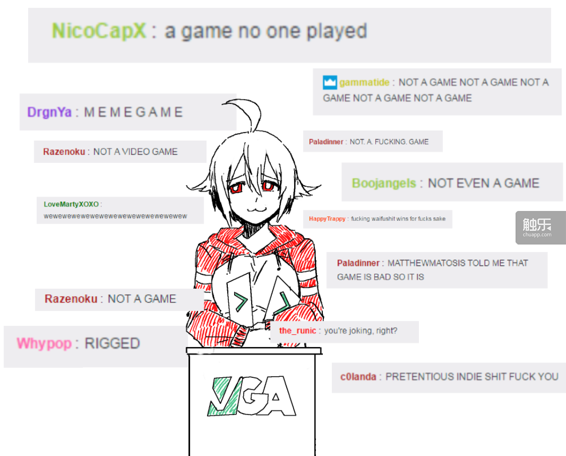 Kiririn51專(zhuān)門(mén)為/v/GA獲獎(jiǎng)繪制的圖,邊上引用的都是在Twitch觀看/v/GA(2016.vidyagaemawards.com)直播的4chan用戶(hù)的狂噴